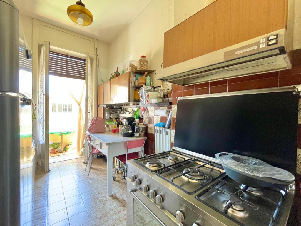 L'appartamento, di circa 100 mq, offre spazi ben distribuiti e funzionali. Attraverso il disimpegno troviamo una comoda cucina con accesso su un balcone funzionale.